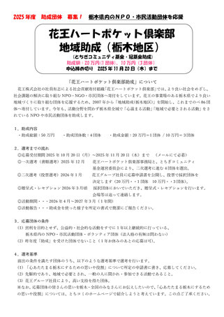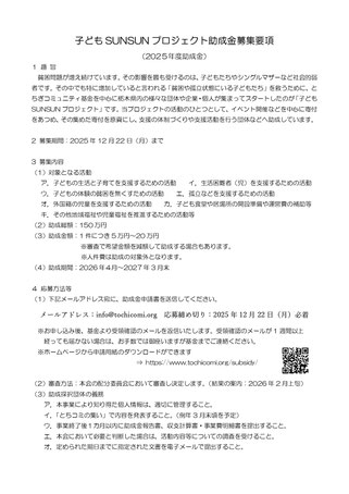 対象団体:こども食堂等の活動、こども食堂等に対する支援活動、子育て支援に関する活動、ひとり親家庭支援に関する1年以上の活動実績を有している団体(法人格の有無は問わない)