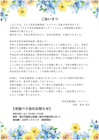30日 8月 2025 手話べり会のお知らせ スマイル 6年前に「手話言語条例」が施行されましたが、まだまだ条例の認知度は理解されず、普及率も進展しておりません。 手話を勉強したいと思う人が、ろう者から直接指導してもらえる共有の居場所づくりが急務と考え、団体の創設となりました。 日時:8月30日(土)10:00~15:00 場所:栃木市国府公民館 参加費:200円 主催:スマイル tagPlaceholderカテゴリ: 登録団体